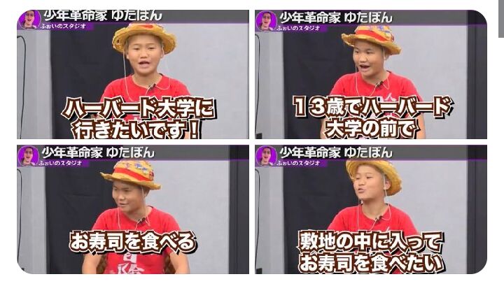 1人目の志願者として登場したゆたぼんさんは、出資希望金額は1000万円だと宣言。用途について「ハーバート大学に行きたいです」と言い、行きたい理由については「やっぱり革命を起こしたいなと思っていて」と説明した。